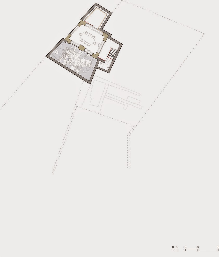 Esta cubierta – plaza incorpora los usos de espacio exterior de la sede comarcal y de aparcamiento, con un espacio histórico bajo ella donde se establezca un diálogo entre nuevos programas institucionales y las estructuras históricas. Se genera una imagen singular dentro de la ciudad, pero siempre silenciosa, entendida desde el respeto a la misma, no a partir de una mera estrategia conservacionista sino desde el entendimiento del lugar.